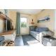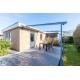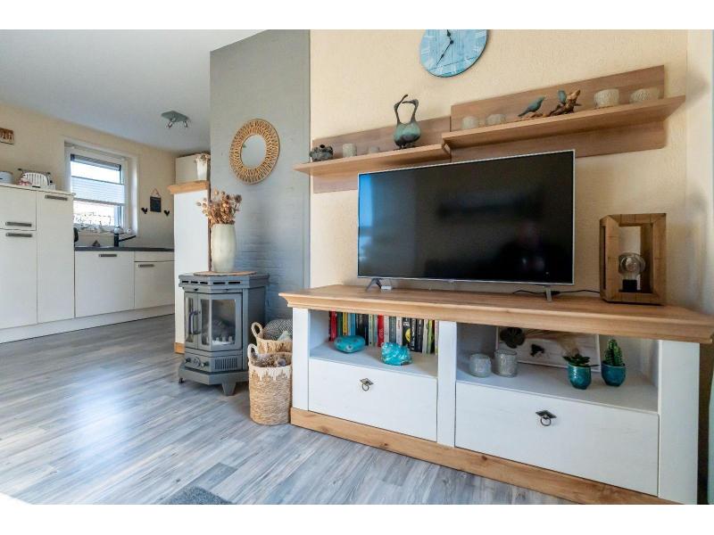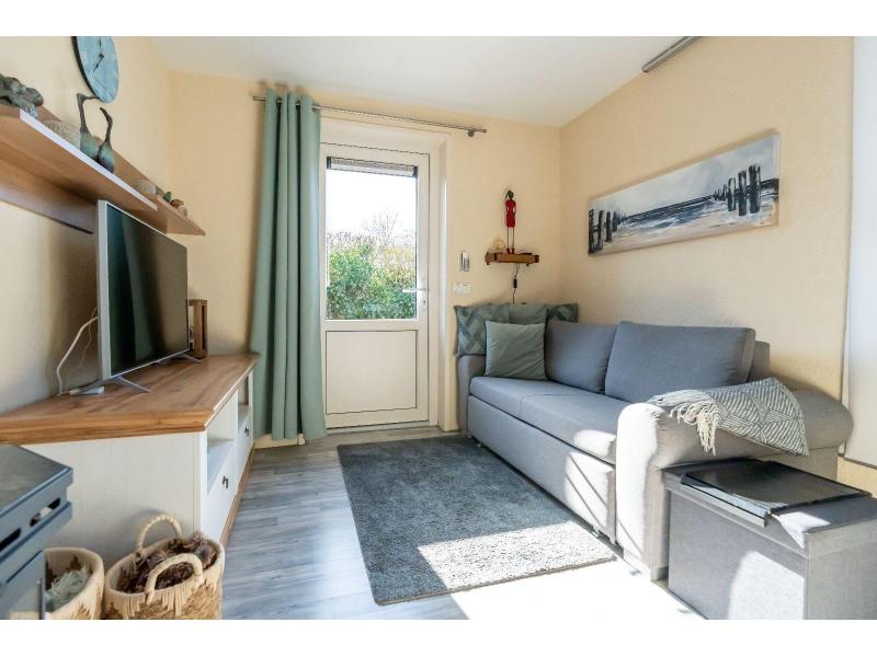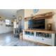 De lichte woonkamer heeft een comfortabele zithoek waar je heerlijk kunt ontspannen na een dag buiten. De airconditioning zorgt niet alleen voor verkoeling in de zomer, maar verwarmt de ruimte ook op koelere dagen, zodat je hier het hele jaar door prettig verblijft. Vanuit de woonkamer loop je zo het terras op met elektrische overkapping, waardoor je vrijwel altijd beschut buiten kunt zitten.