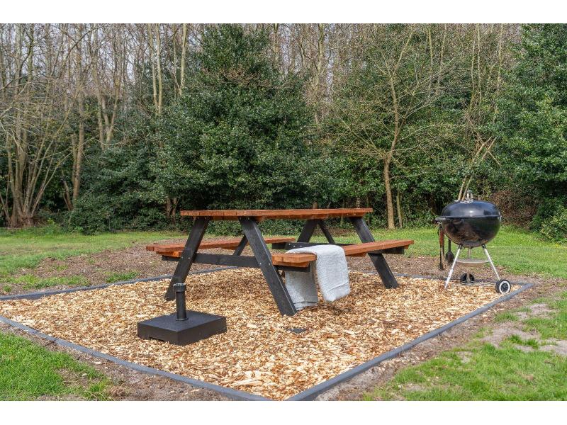 In de grote zonnige tuin kun je in alle privacy tot rust komen. Op het terrein vind je een tuintafel met stoelen, picknicktafel, een barbecue en een grote trampoline. Achter het huis ligt een eigen stuk bos, een fantastische plek om te spelen of bijvoorbeeld een boomhut te bouwen.