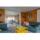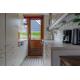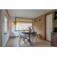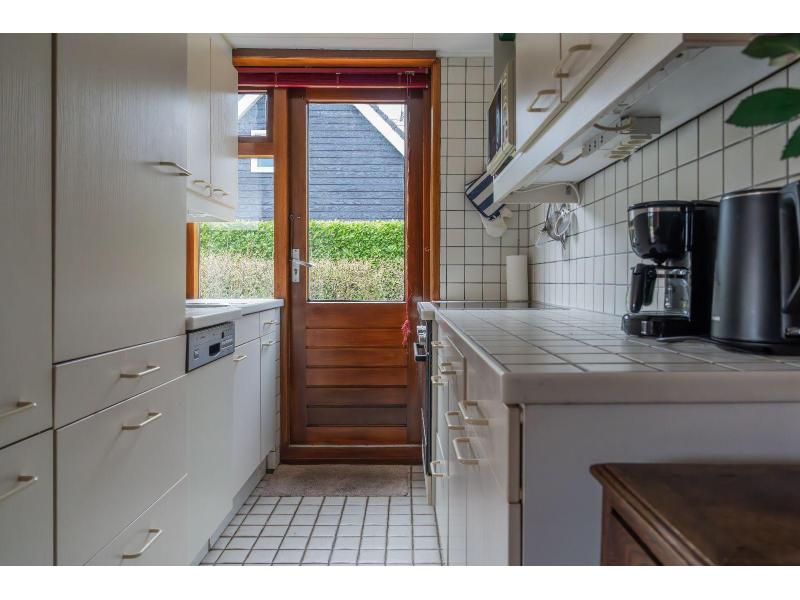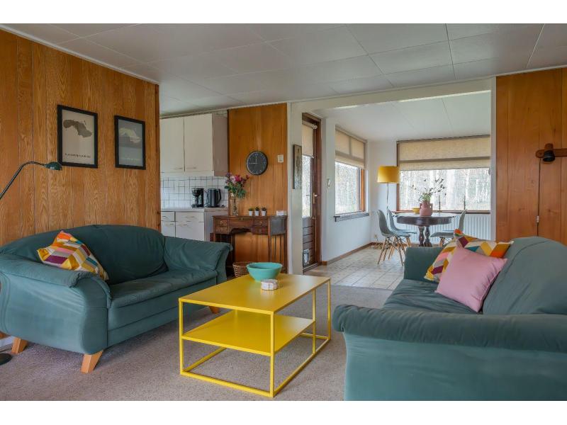 Binnen vind je een lichte, gezellige woonkamer met een zithoek met televisie en een ruime eethoek. De open keuken is praktisch ingericht en voorzien van alle benodigde apparatuur, zoals een vaatwasser, een combimagnetron en een koelkast met vriesvak.