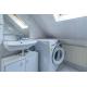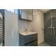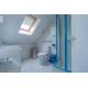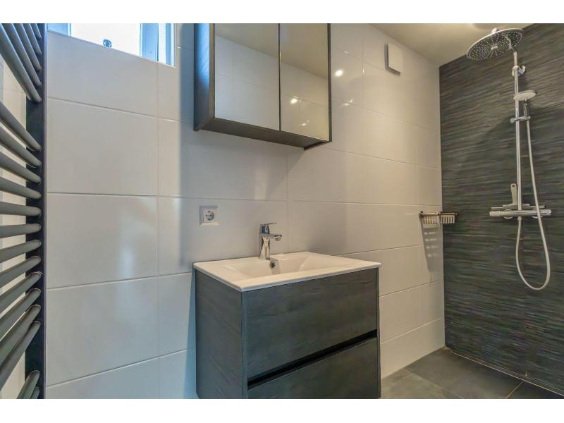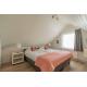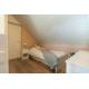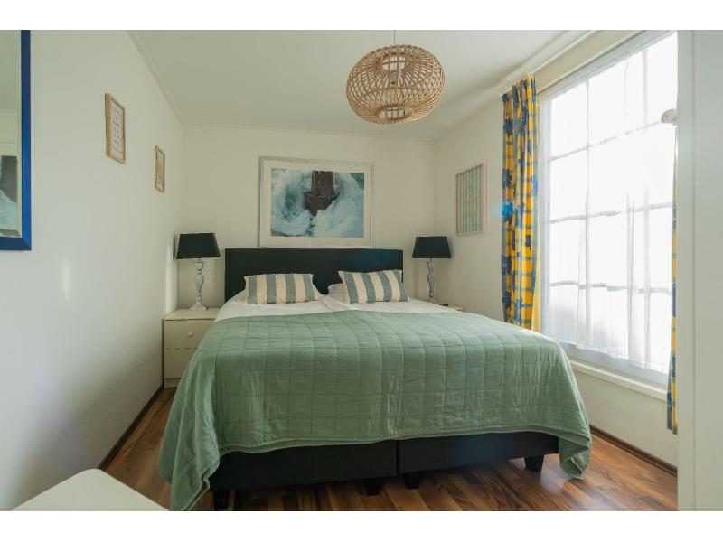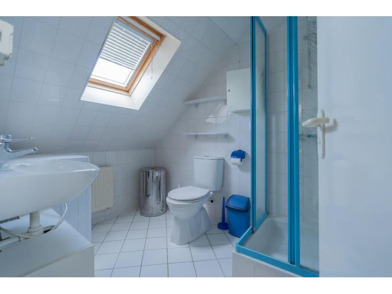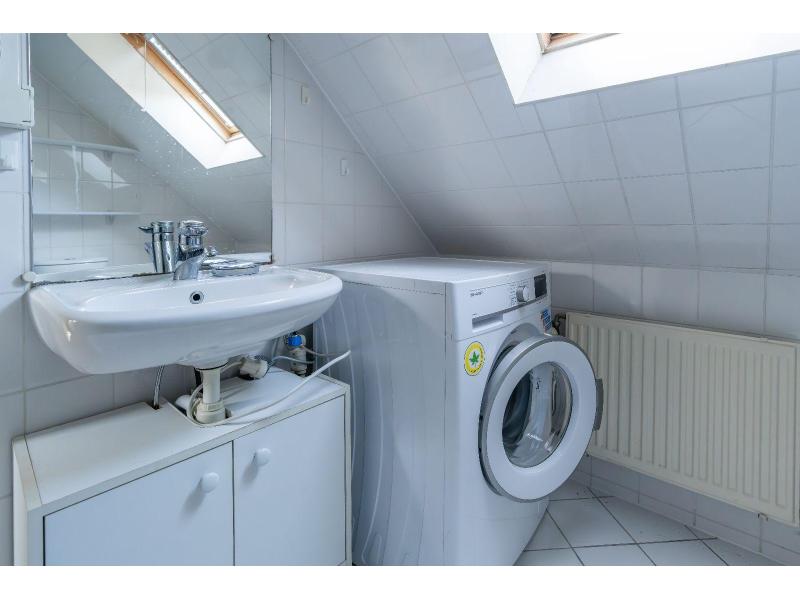 Via de trap in de hal bereik je de overloop, waar een eenpersoonsbed en een bureau staan. Op dezelfde verdieping bevindt zich de tweede slaapkamer, eveneens ingericht met een tweepersoons boxspringbed. Daarnaast vind je op deze etage een tweede badkamer, uitgerust met een douche, wastafel, toilet en een wasmachine – ideaal voor een langer verblijf.