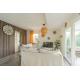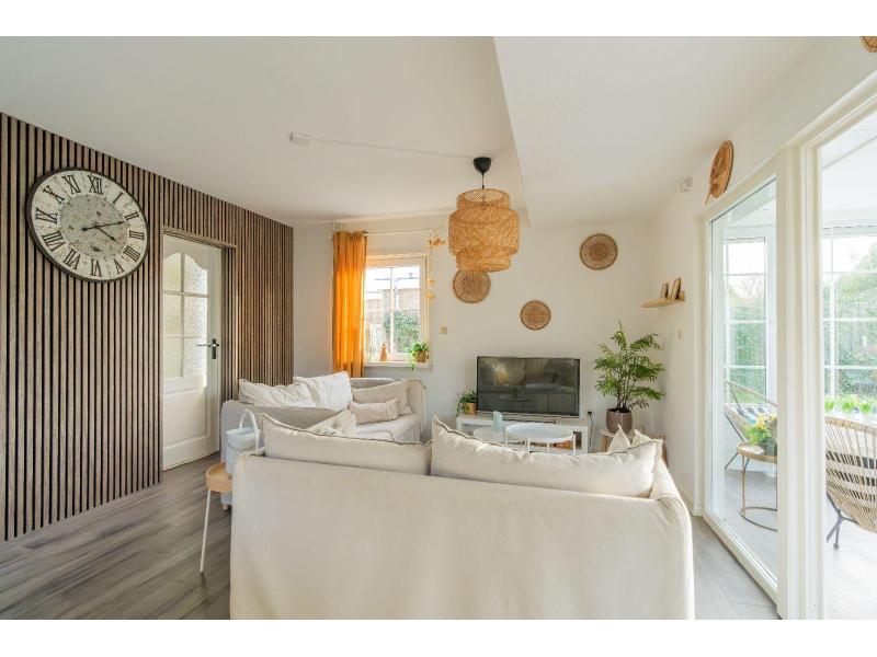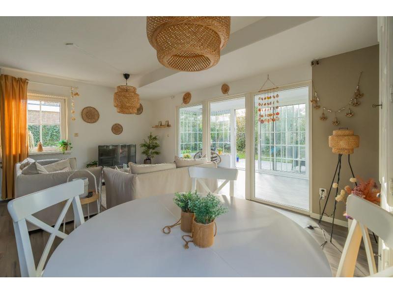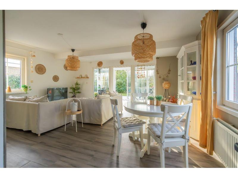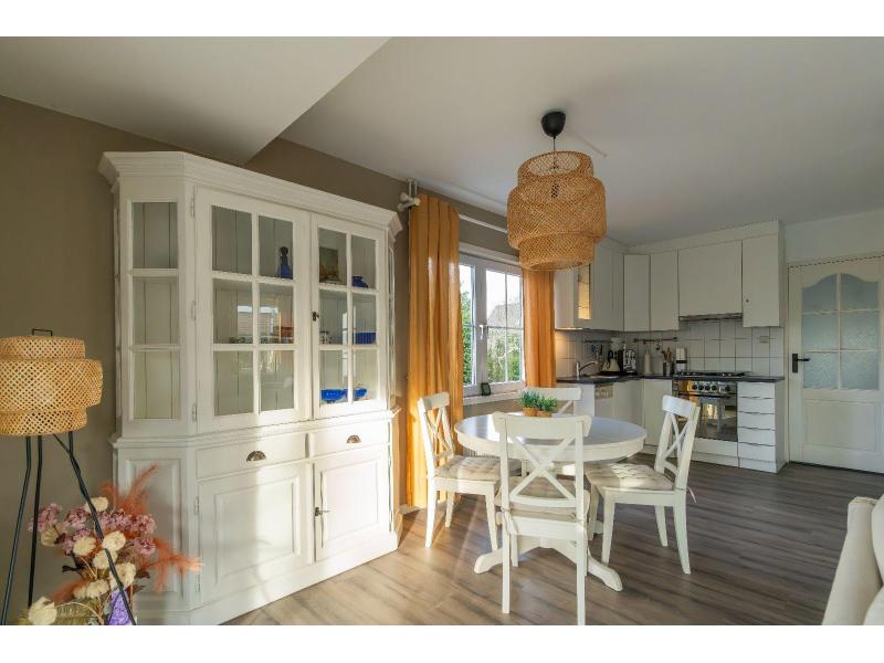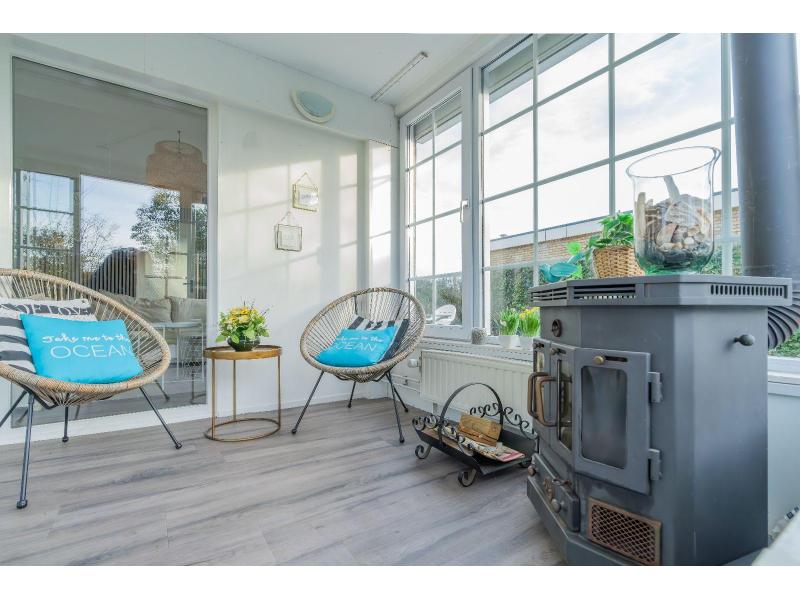 Wanneer je binnenstapt, kom je direct in de gezellige woonkamer met een knus zitgedeelte. Deze ruimte loopt naadloos over in de serre met houtkachel. Hier kun je lekker ontspannen bij het haardvuur met een boek of een drankje. Grenzend aan het woongedeelte ligt de open keuken, die van alle gemakken is voorzien.
