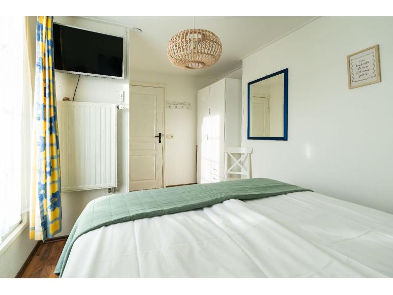 Op de begane grond bevindt zich een comfortabele slaapkamer, ingericht met een tweepersoons boxspringbed, een televisie en voldoende kastruimte. Daarnaast vind je hier een moderne badkamer en een separate toiletruimte.