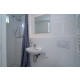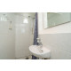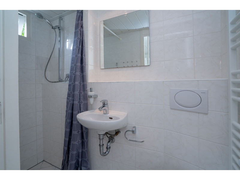 De badkamer is uitgerust met een douche, een wastafel en een toilet.
