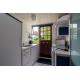 De open keuken beschikt over een 4-pits gaskookplaat, een vaatwasser, een koelkast met vriesvak en een combimagnetron.